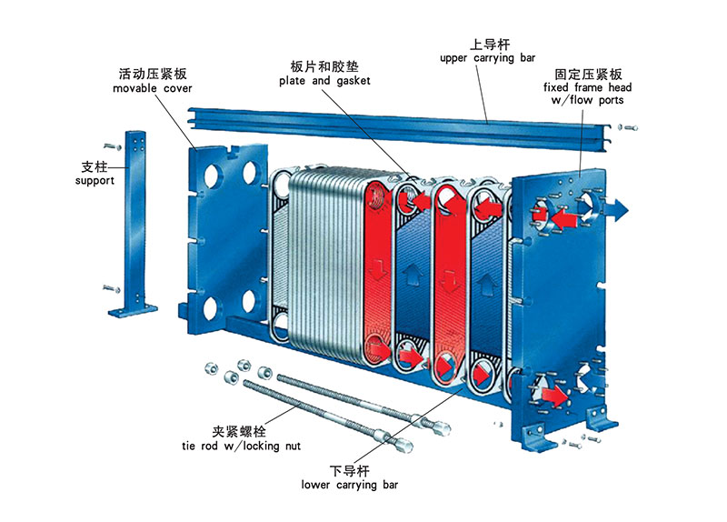 一、產(chǎn)品概述板式換熱器廣泛應(yīng)用于供熱取暖、熱水洗浴、空調(diào)、液壓油冷卻、石油化工、制藥、食品加工等領(lǐng)域。板式換熱器是目前各類換熱器當(dāng)中換熱效率很高的一種換熱器,它占用空間小,安裝拆卸方便。板式換熱器的結(jié)構(gòu)分解如圖1,主要部件是由換熱板片、密封膠墊、夾緊板、導(dǎo)桿、夾緊螺栓組成。換熱板片是由不銹鋼板壓制成型,它上面開有4個(gè)流道孔,中部壓成人字形波紋,四周壓有密封槽。密封槽內(nèi)粘有密封膠墊。換熱板片通過兩...